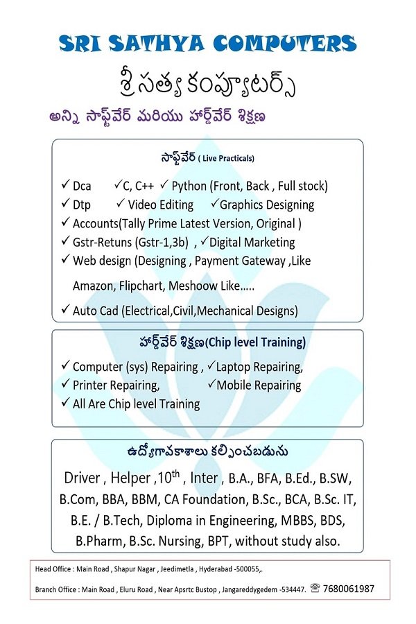 Sri Sathya Computers offers professional and job-oriented software training courses in Buttayagudem, Eluru. Our courses are designed for students, job seekers, and working professionals who want to build strong technical skills and grow their careers in the IT field.